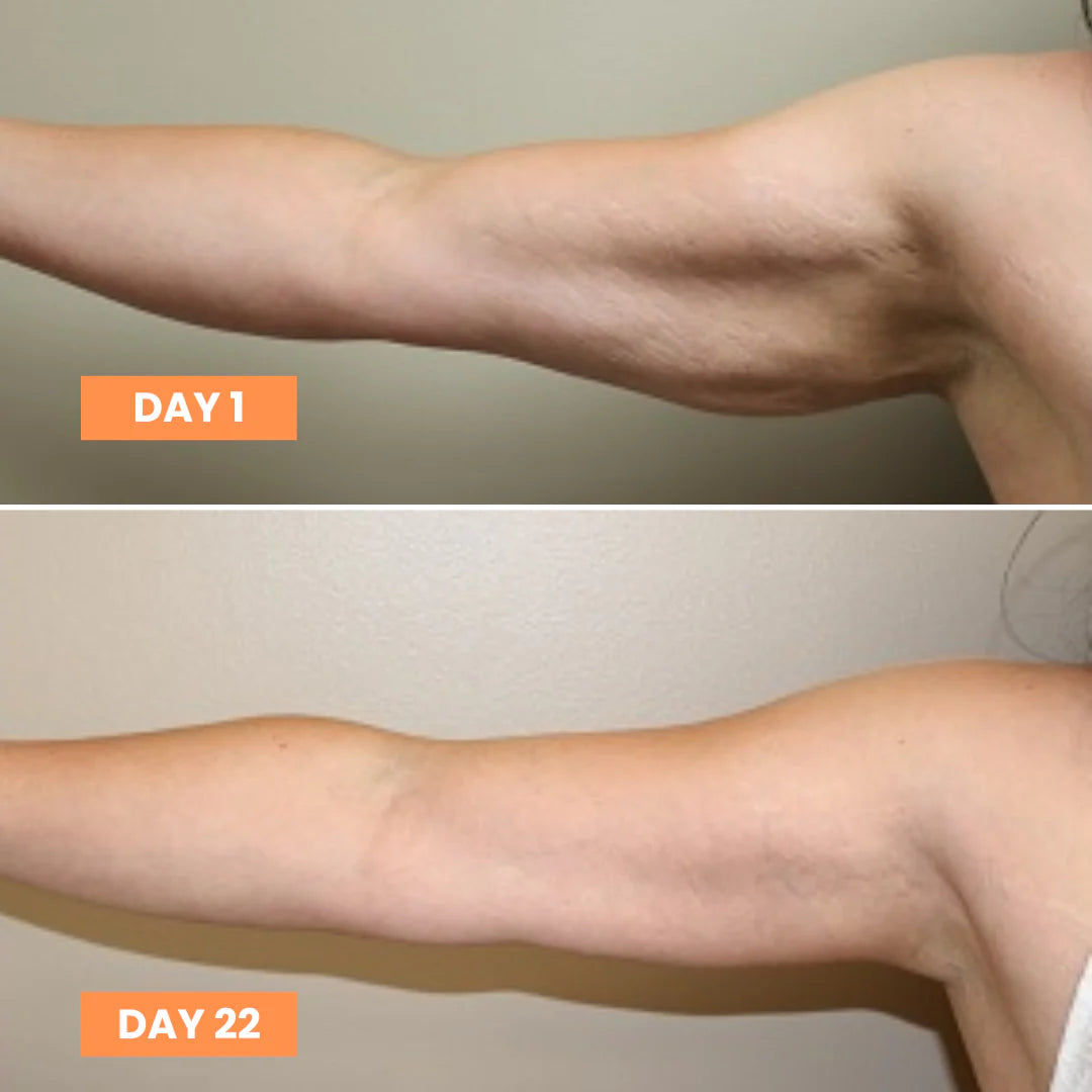 Our compression wear works by applying gentle pressure that supports blood flow and reduces fluid retention. Combined with thermal activation, this helps smooth and firm areas like your arms and waist where skin tends to lose definition with age.